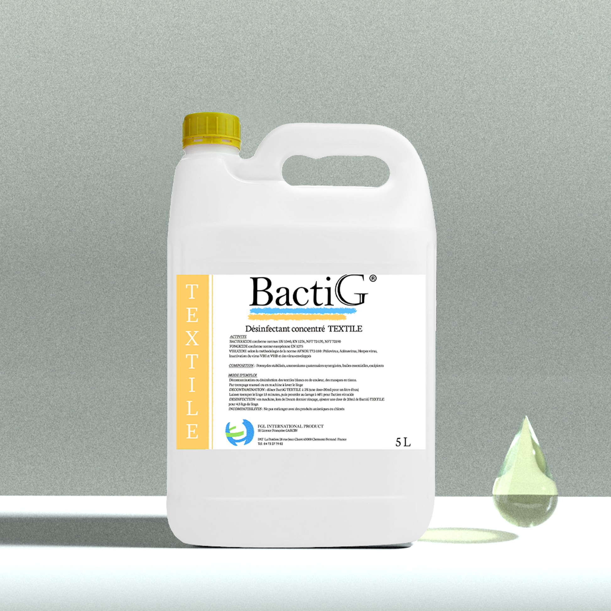 DESINFECTION : en machine, lors de l'avant dernier rinçage, ajouter une dose de 20ml de BactiG TEXTILE pour 4/5 kgs de linge.